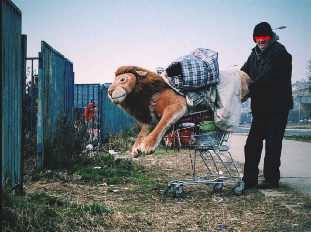 I find this composition interesting for the fact that the man is pushing a supermarket cart ( that is obviously out of place and doesn’t belong to the environment the man is in ) and at the same time he his carrying a large toy and other items that were abandoned by someone, so in a way it may speak of the excess of consumerism while tackling a social issue at the same time.